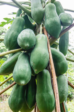 Bunch of fresh green papaya fruits on papaya tree. Family farming. Food industry. Organic food. Material for traditional food in south-east Asia, Som-Tum.