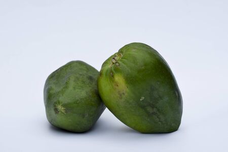 Two Green papaya, papaw or pawpaw or Raw papaya fruit Indian Mexico American used for cuisine cooking dishes salad curry (sabji) Green vegetable with medicinal properties
