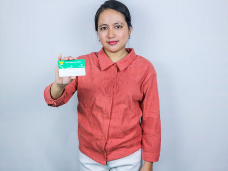 Beautiful Indonesian woman wearing pink shirt hold Kartu Indonesia Sehat (Health Insurance card from the Government of Indonesia) under the auspices of the BPJS