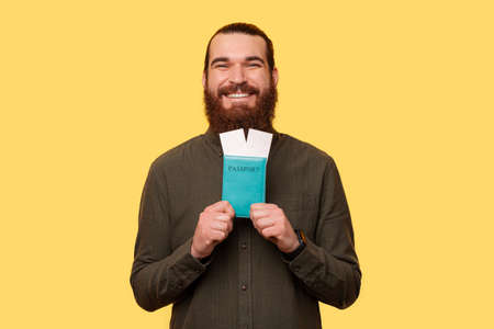 A picture of bearded man holding a passport and some plane tickets
