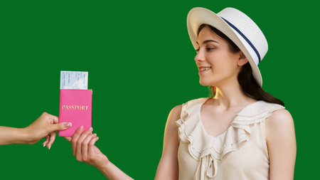 Happy traveler woman receiving pink passport tickets ready for upcoming adventure isolated on green copy space background.