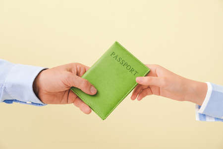 Hands with passport on color background