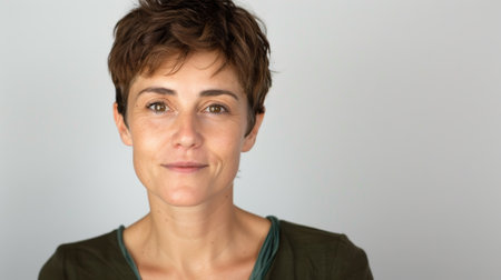 Senior woman with a serious expression wearing a green sweater, showcasing natural beauty and aging gracefully against a soft, neutral background