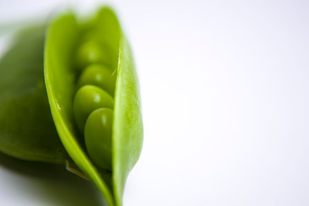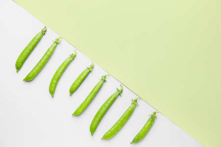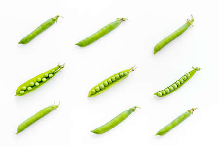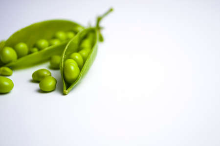 green ripe peas, green beans on a white background, vegetarian food close up