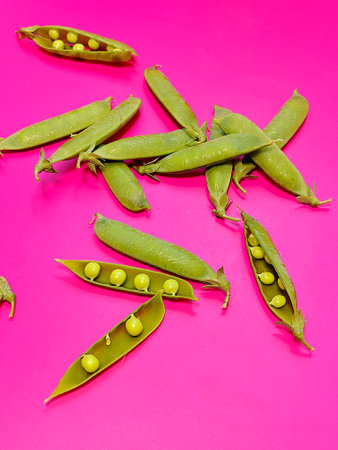 green baby peas, shell peas, green peas on a pink background, bright pink background, contrasting colors