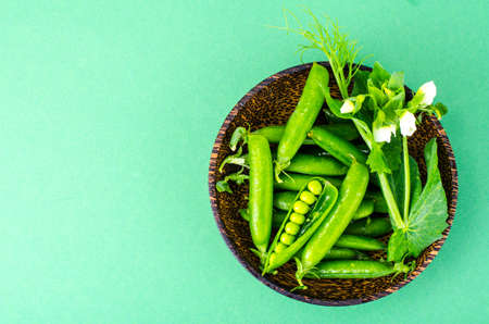 Wooden bowl with pods of green peas. Studio Photo