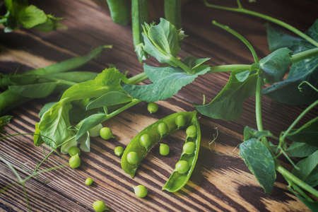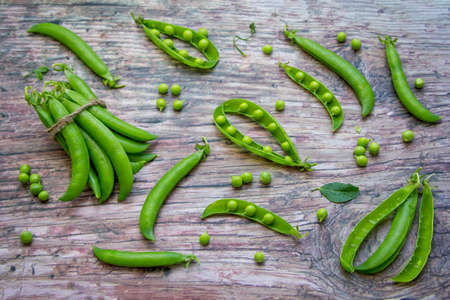 Delicious ripe green peas lying on a wooden table.