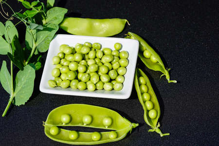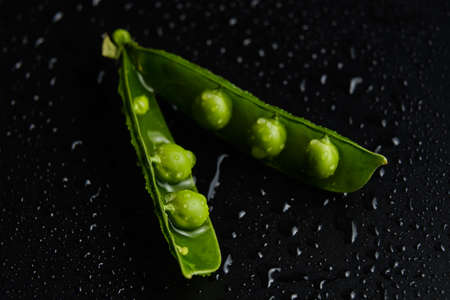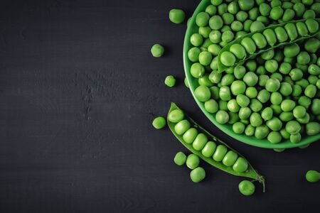 Vegetable backdrop vith copy space for your projects. Close up of fresh ripe green peas on black background