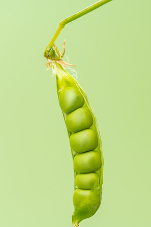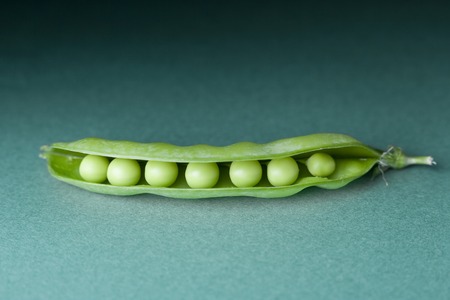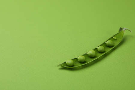 Green pea pod with seeds on green background