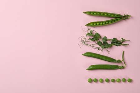 Pods of fresh green peas and green scattered peas. nature background. design element.