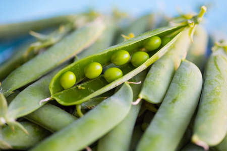 Macro close up of fresh garden sugar snap peas in their pods ready for preparing or eating.
