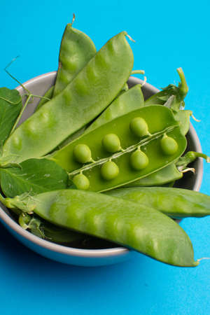 Fresh green ripe green peas in bowl copy space close up isolated on trendy blue background