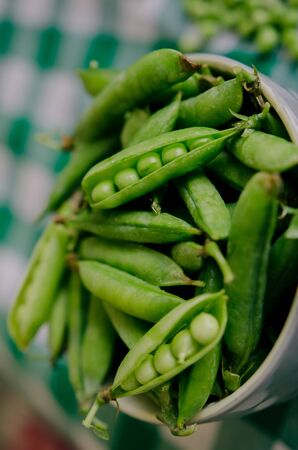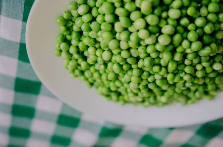 Green peas on a green tablecloth in the kitchen