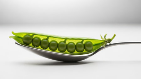 Macro of bright green peas in vibrant pod shell held on metallic utensil, healthy vegetable food