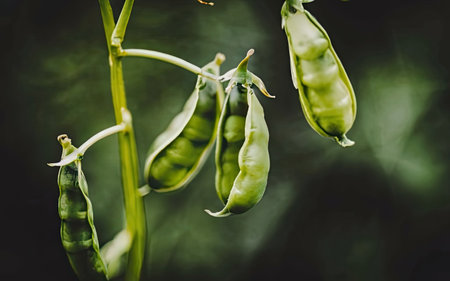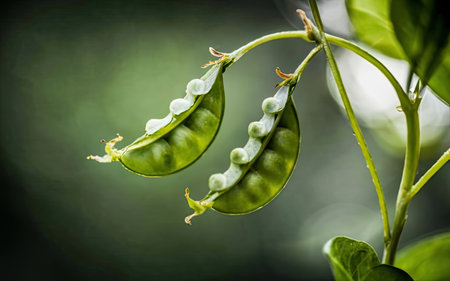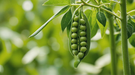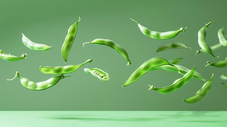 Floating in a serene green space, these vibrant pea pods create a dynamic and harmonious visual. Capturing a sense of freshness and natural beauty, this Generated AI image evokes tranquility