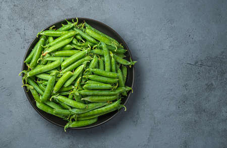 A plate with pea pods on a gray background. Copy space. Healthy, organic food.