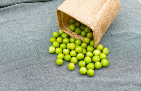 Delicious green plums in a small burlap sack high angle view on a grey picnic cloth background