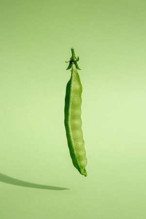 Pod of ripe green peas on a green background in zero gravity Green monochrome and antigravity Vegan food concept