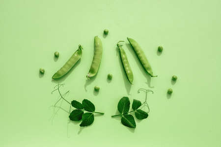 Young fresh juicy pods of green peas on a green textile background. Healthy organic food.