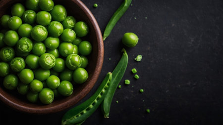 AI Generated. Fresh green peas in a bowl on a black background, top view, copy space