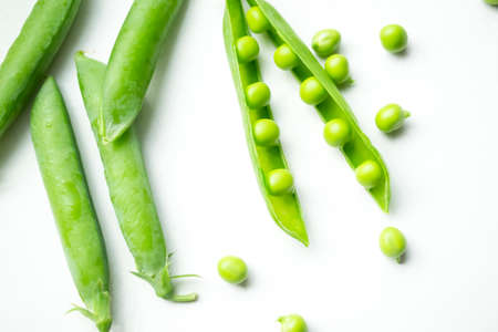 Green peas in pods on a white background, healthy vegetarian food.