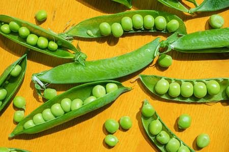 Ripe peas in pods on a yellow wooden background. The concept of summer, pea crop, healthy vitamin food.