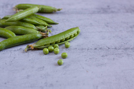 Pea pods and open peas on a gray background with space for copying. Natural, healthy food.