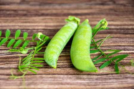 Green peas close up. Pea leaves and pods on a wooden background.
