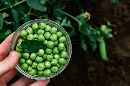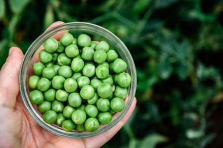 Green peas harvest in a glass bowl in the garden.