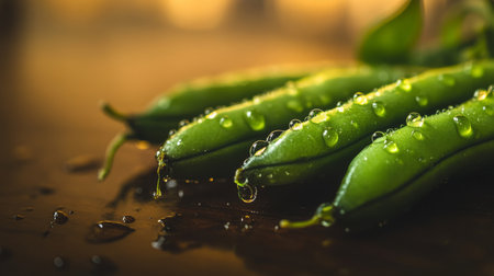 Close-up image of fresh green peas resting on a wooden surface. Water droplets enhance the vibrant color and freshness, showcasing natural beauty.