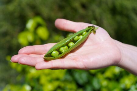 Hand of woman showing an open pea pod in her palm in the sunlight in the greenery
