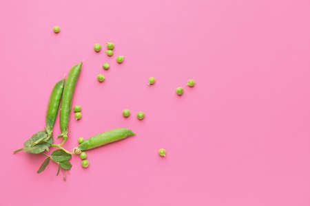 Fresh green pea on pink background, space for text
