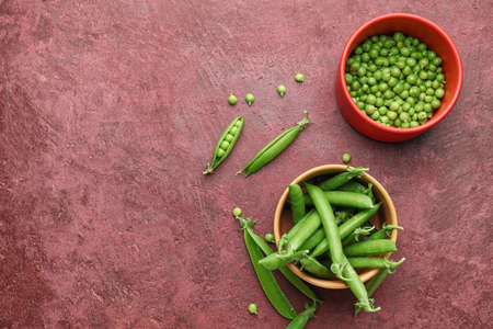 Bowls with tasty fresh peas on color background