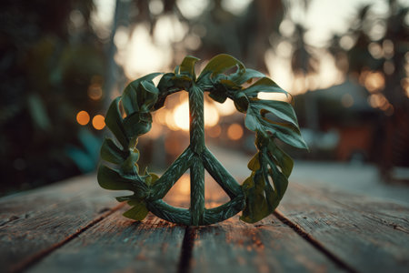 Tropical leaves form a peace symbol on a wooden table, with a soft sunset glow in the background, evoking feelings of tranquility and nature's beauty