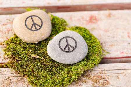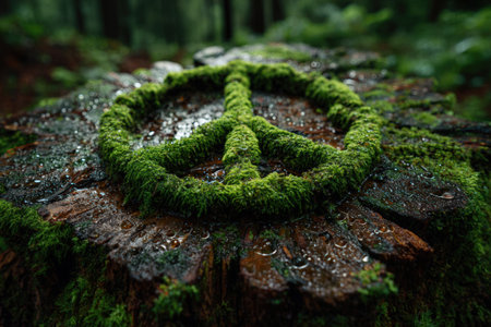 Peace symbol crafted from moss on a tree stump surrounded by greenery, highlighting the connection between nature and serenity in a peaceful forest setting