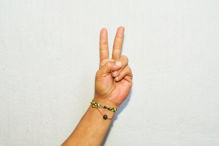 Hand with peace and victory sign on white wall background, Thailand.