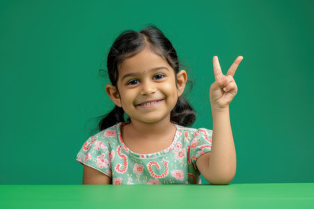 Young happy Indian girl sitting at a table and showing the ok sign with her hand isolated on a green background.