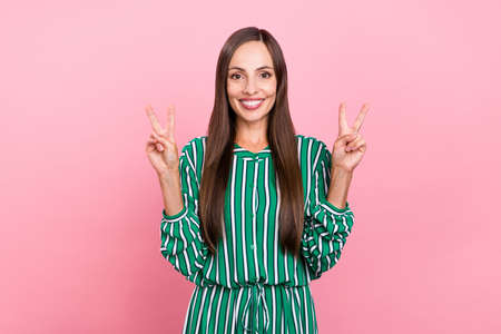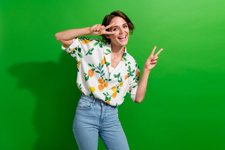 Photo of adorable shiny woman wear blue shirt showing v-sign smiling isolated green color background