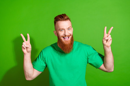 Photo of optimistic man with ginger long beard dressed stylish t-shirt two hands show v-sygn symbol isolated on green color background