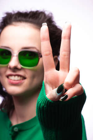 beautiful girl in green glasses and a green sweater shows two fingers, Victoria gesture