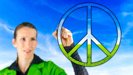 Woman drawing a peace sign against a blue sky depicting anti-war, pacifism and conservation of natural resources and the planet