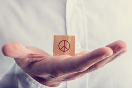Man holding a wooden block with the peace sign balanced on the palm of his hand in a conceptual image with a retro vintage filter effect.