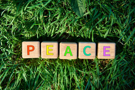 Top view of wooden cubes with multicolor PEACE text on fresh green grass in sunlight