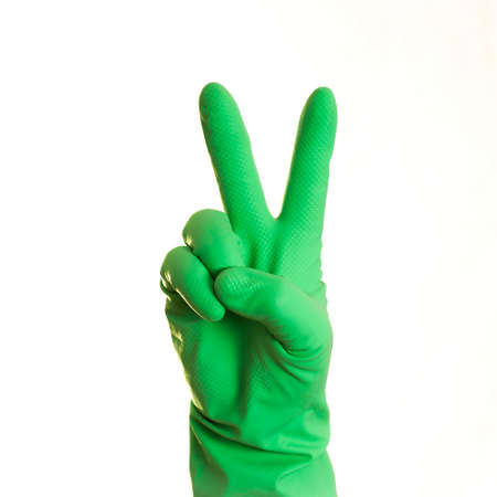 A hand in green glove on a white background, isolated