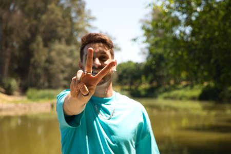Raise two fingers to symbolize peace or victory against a blurry background.