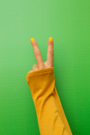 A woman's hand with her nails painted yellow on a green background, raising her two fingers in victory.
