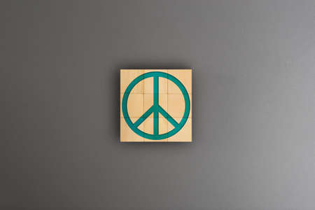 Symbol peace on wooden block over gray background, War, Boycott, Nuclear war, Hope, Economy