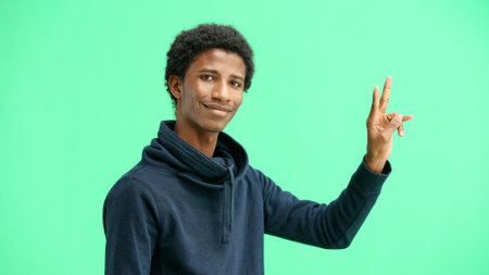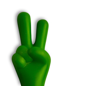 Male hand on green background shows hand sign, victory gesture.