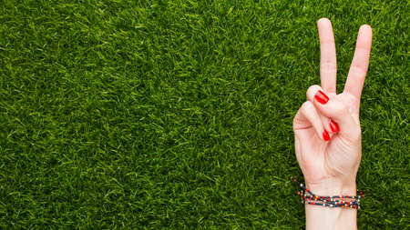 Women hold two fingers on green grass background texture