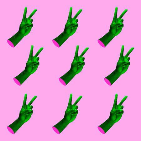 Contemporary minimalistic artwork in neon bold colors with hands showing victory sign. Surrealism creative wallpaper. Psychedelic design pattern.